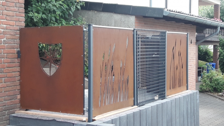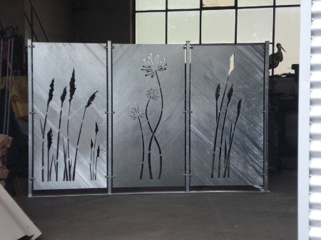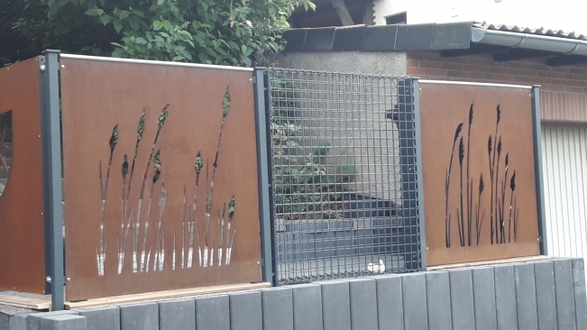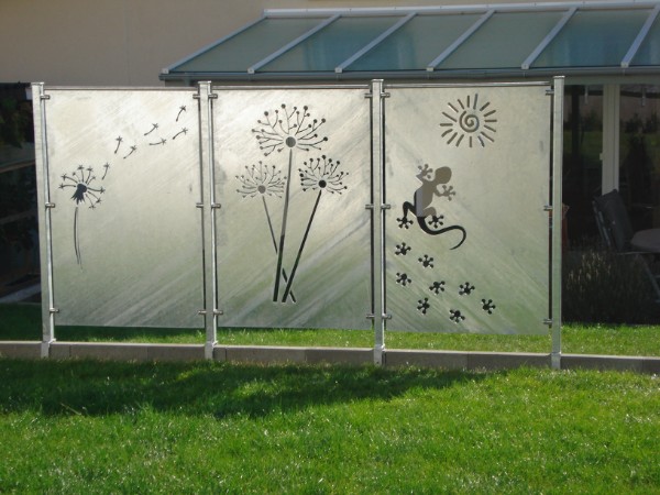 Sichtschutzwand in feuerverzinkter Ausführung. Die Wände sind180 cm hoch. Viele verschiedene Motive sind möglich.