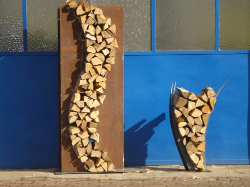 Holzlegen. Links ca. 200 cm hoch. Die Holzlege auf der rechten Seite wird in Kundenwunschgröße gefertigt.