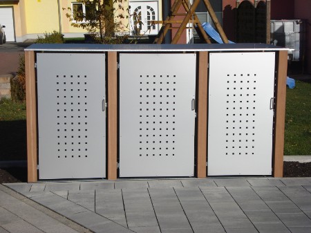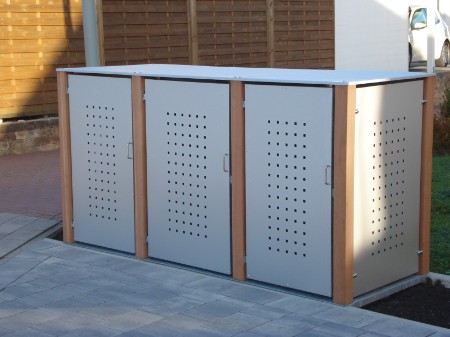 Mülltonnenbox. Holz: Bangkirai. Türen, Seiten- und Hinterwand aus eloxiertem Aluminiumlochblech. Blechaufnahmen aus Edelstahl.