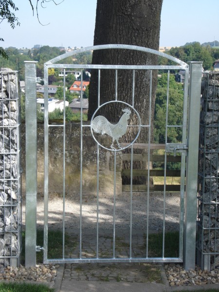 Gartentor, auf Wunsch des Kunden mit dem Motiv eines Hahns gefertigt.